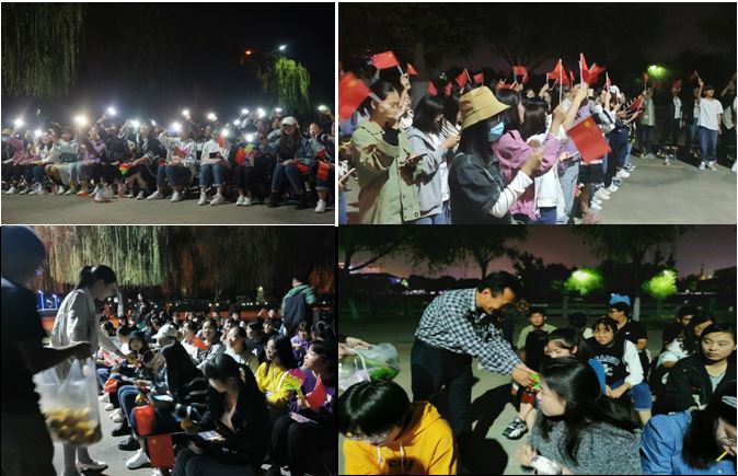红旗飘扬,月饼飘香,2020年的中秋节与国庆节喜相逢。为庆祝双节,使2020级新生感受到来自建工公司大家庭的温暖,10月1日晚7点,公司在汉梁楼前小广场举行“喜迎双节 爱在商师”迎新晚会。党总支副书记张晓春、团总支书记韩秋、20级辅导员张颖辉老师出席晚会,20级体全体新生以及教官参加活动。
