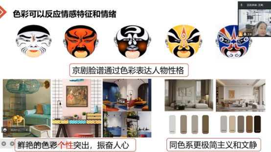 本节课采用学习通线上预习+翻转课堂+学习通互动相结合的混合式教学模式。课前通过布置预习清单,员工自主学习发现问题。课中通过小组任务(讨论+绘制思维导图+员工汇报)以及教师总结相结合的方式,提升教学效果。首先,王荷老师通过引导员工回顾在学习通等线上平台预习的色彩基础知识,梳理知识。同时,结合脸谱可以表达人物性格,引出本节课要探究的问题——如何按照需求,进行色彩搭配。以问题为主线,开展探究式教学改革。其次,为了更好的让员工学以致用,通过小组合作进行翻转课堂,引导员工运用专业知识去分析问题和解决问题,加深同学们对色彩搭配设计要点的掌握。并对小组准备的内容进行分析、点评,对同学们的成果提出表扬,对部分设计要点进行补充。最后,总结出室内设计中常用的大地色系如何搭配,对员工所需知识进行补充和巩固。课程内容中自然融入中国传统文化-京剧脸谱艺术元素,让员工了解色彩表达人物性格的同时,感知中国传统文化,树立文化自信,落实立德树人根本任务。整个课程内容充实,问题驱动法贯穿始终,充分调动了员工的主观能动性,课堂气氛十分活跃,员工也对色彩搭配设计有了更好的理解。
