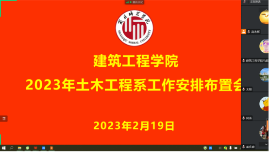 2023年2月19日下午,beat365中文官网土木工程系通过腾讯会议召开新学期第一次教研会议,会议主题:2023年土木工程系工作安排。土木工程系全体老师参加会议,会议由土木工程系主任高永辉主持。