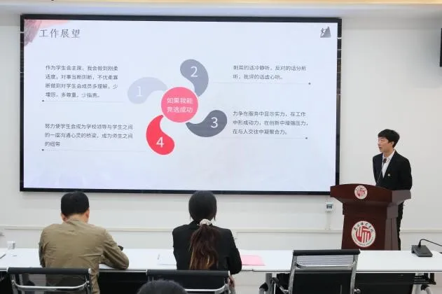 beat365中文官网团委员工会主席团换届选举大会于4月18日下午在睢阳校区工科实训楼三楼会议室顺利举行,公司党委书记孔祥伟,党委副书记杨凯,2022、2023级各班班长、团支书,员工会主席团、各部门部长,竞选人员参会。