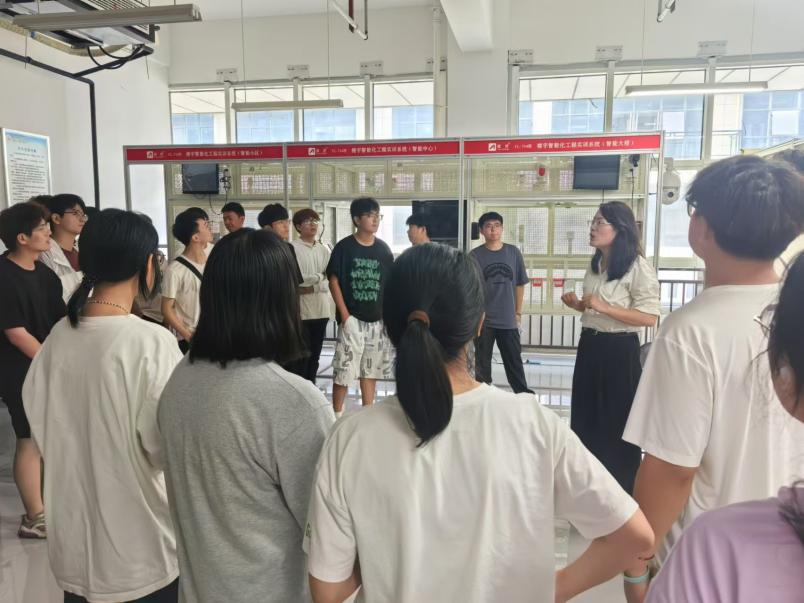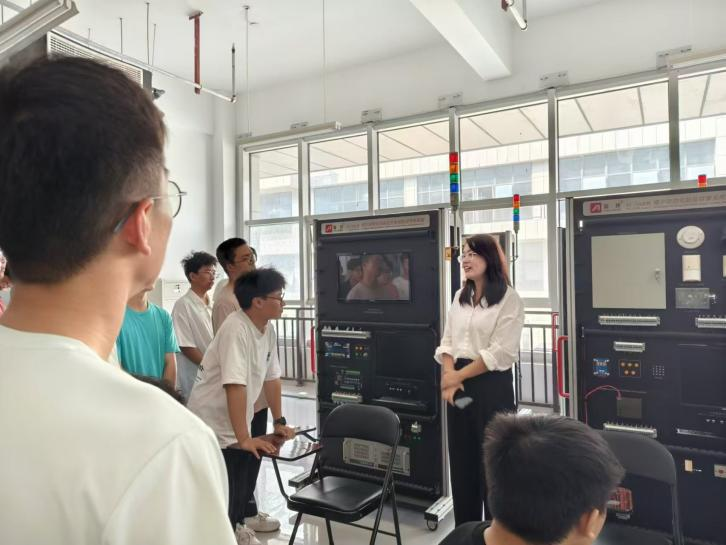 戚瑷娜带领同学们参观楼宇智能化工程实训系统。实训装置模拟了实际的建筑场景,为员工提供了接近工程现场的实训环境。同时向同学们介绍了楼宇智能化设备监控系统,让他们了解先进的传感器技术、自动化控制技术和通信技术是如何实现对楼宇设备的实时监测、控制和优化管理的。